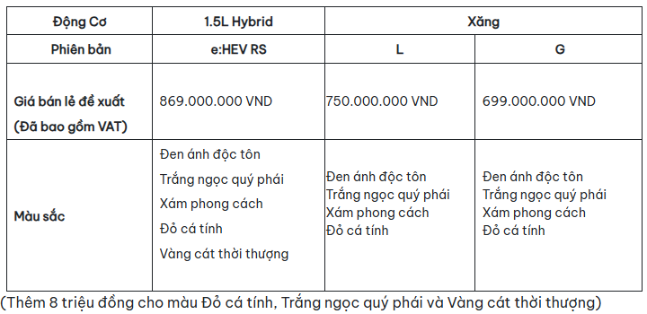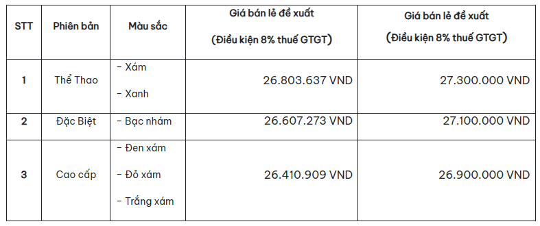 > Giá bán lẻ đề xuất cho xe (bao gồm 01 bộ sạc đi kèm, không bao gồm pin):