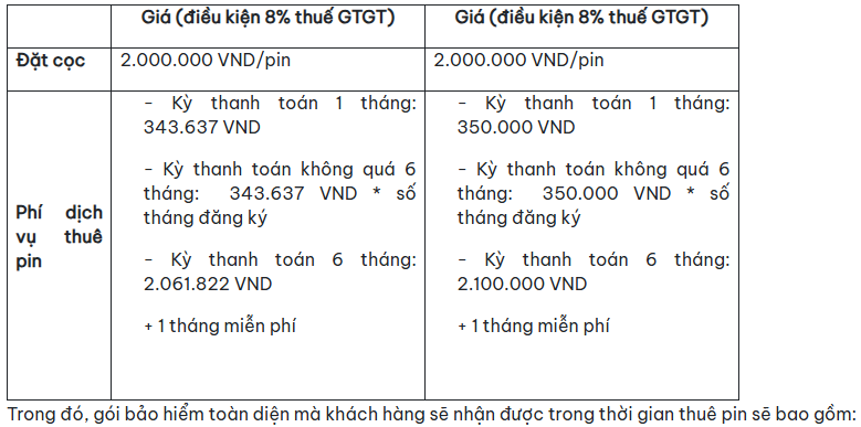 Pin xe sẽ được cho thuê theo các gói đăng ký, đi kèm gói bảo hiểm toàn diện, giúp khách hàng an tâm trước mọi rủi ro với mức phí hấp dẫn. Đặc biệt, khách hàng có thể sử dụng pin mà không bị giới hạn quãng đường, mang đến trải nghiệm di chuyển linh hoạt và trọn vẹn.